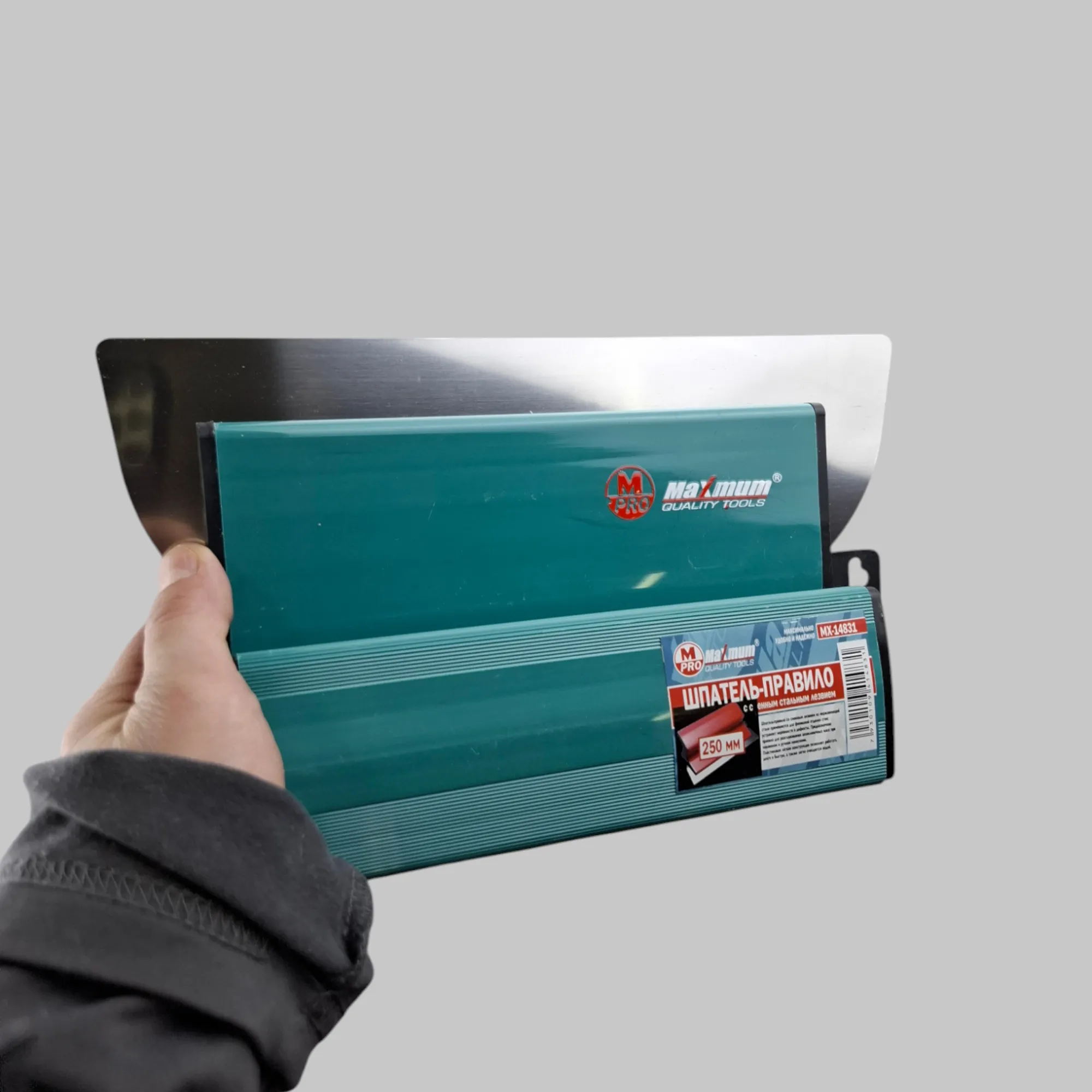 Шпатель-правило со сменным лезвием 250 мм от "MAXIMUM QUALITY TOOLS" используется для выравнивания стен.
