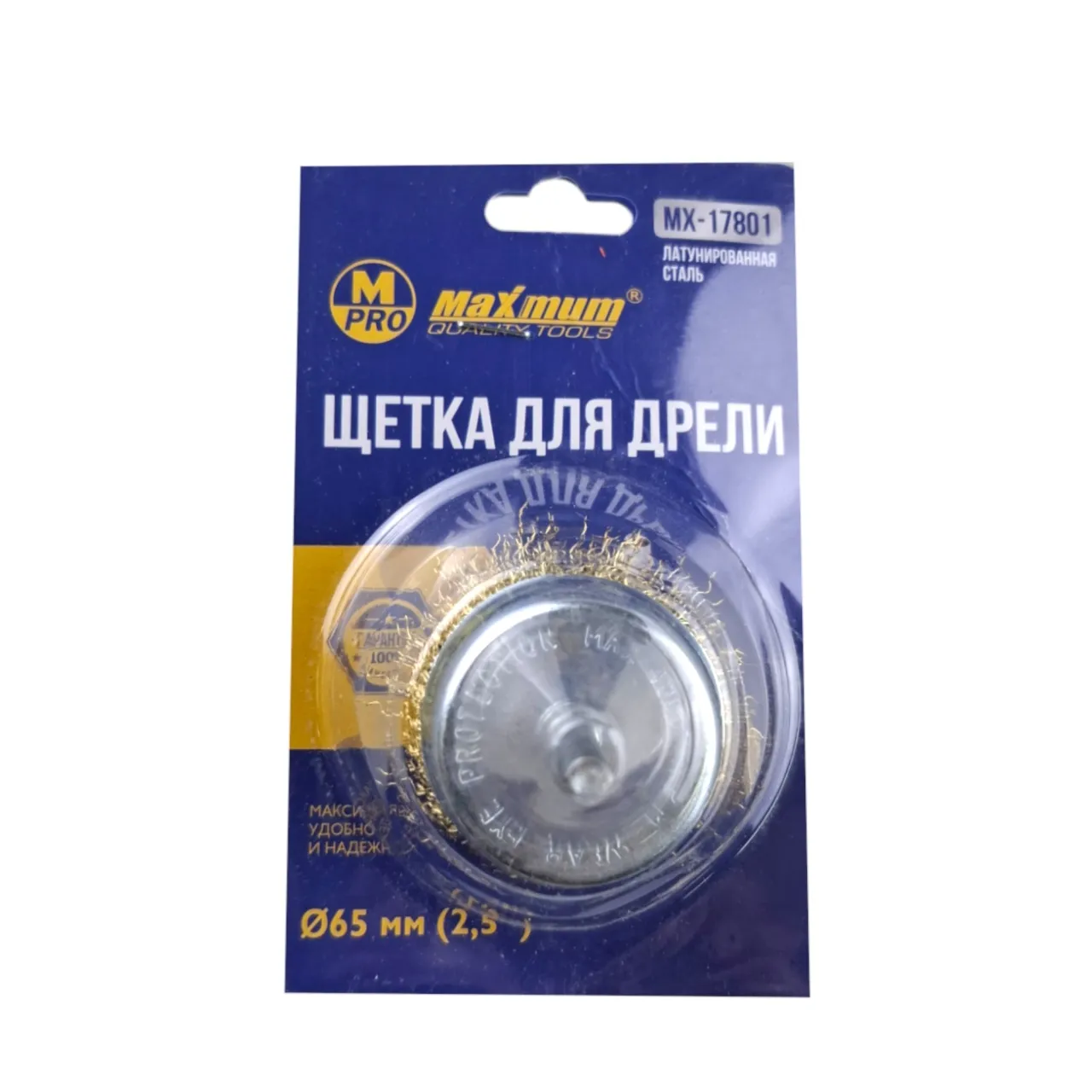 Щетка для дрели чашечная 65 мм с волнистой латунированной проволокой от «MAXIMUM» — это качественная, универсальная и безопасная щетка для широкого круга слесарных и подготовительных работ с использованием дрели. Шпилька — цилиндрический хвостовик диаметром 6 мм — предназначена для установки в шуруповерты и дрели.