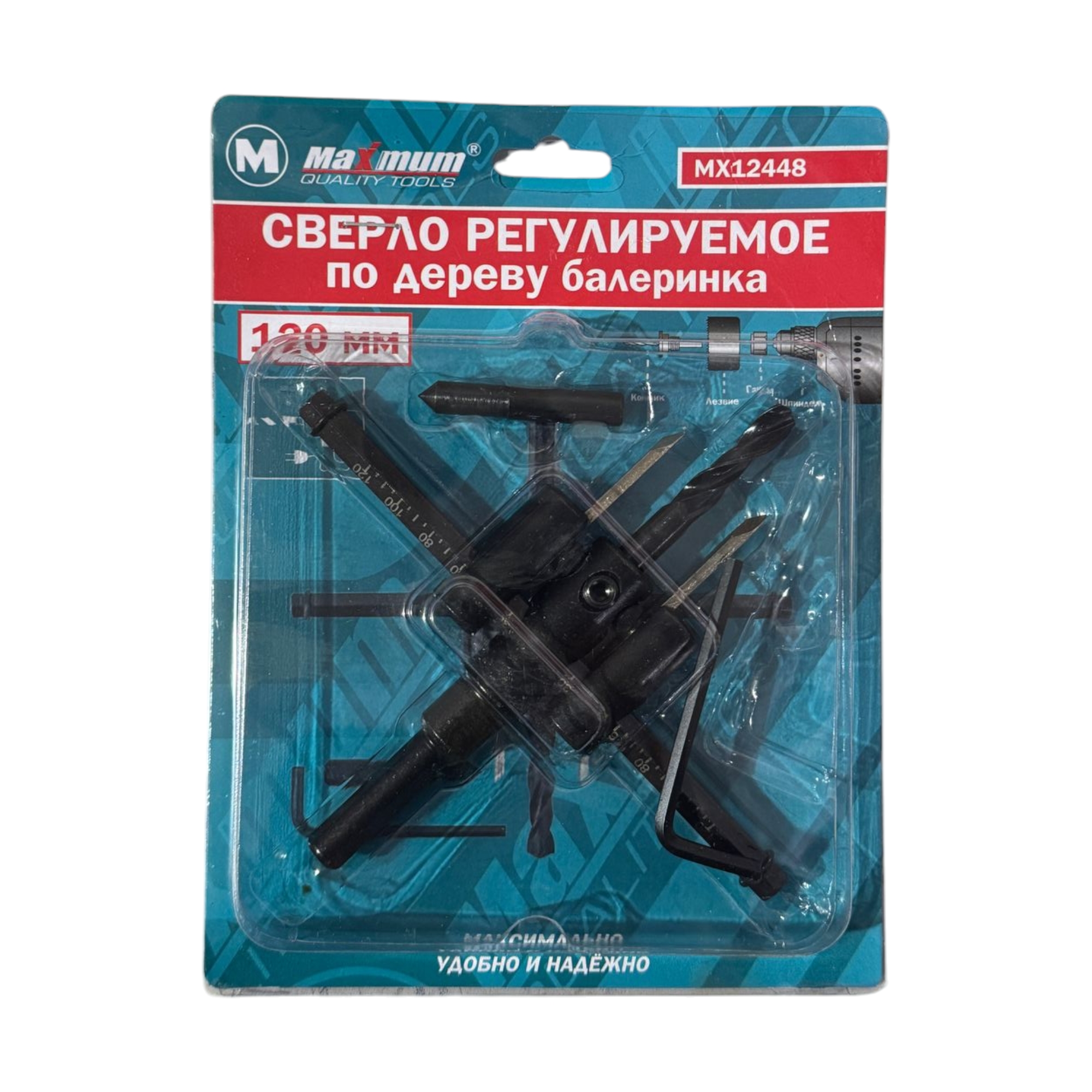 Сверло регулируемое по дереву балеринка 120 мм от Maximum выполнено из углеродистой стали и предназначено для высверливания отверстий большого диаметра в дереве, фанере, ДСП, ДВП, ламинате, гипсокартоне.